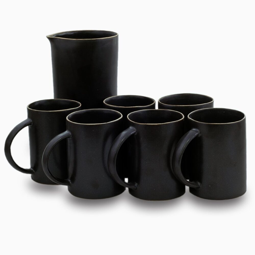Coco Black Shady Collection handmade set of 6 mugs with handle, and 1 Jug; Master Artisans have reach a perfectly imperfect shape. The mug is organic, and has especially been created to be a functional piece of Art by itself. The anthracite black glaze bring class and uniqueness to the finished item. Each piece react differently during the firing, and each piece becomes very unique. About the handmade Bowls sets; 6 Pasta Bowls 20 cm. Master Artisans have reach perfectly imperfect shapes. Stunning anthracite black micro-reactive glaze. All dishware are food safe, dishwasher safe, and microwave safe.