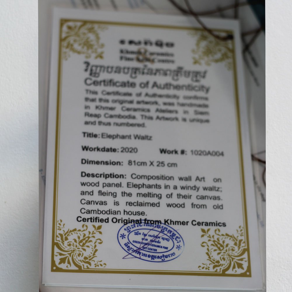 Composition wall Art on wood panel. Elephants in a windy waltz; and fleeing the melting of their canvas. Canvas is reclaimed wood from old Cambodian house. FREE Shipping WORLDWIDE.