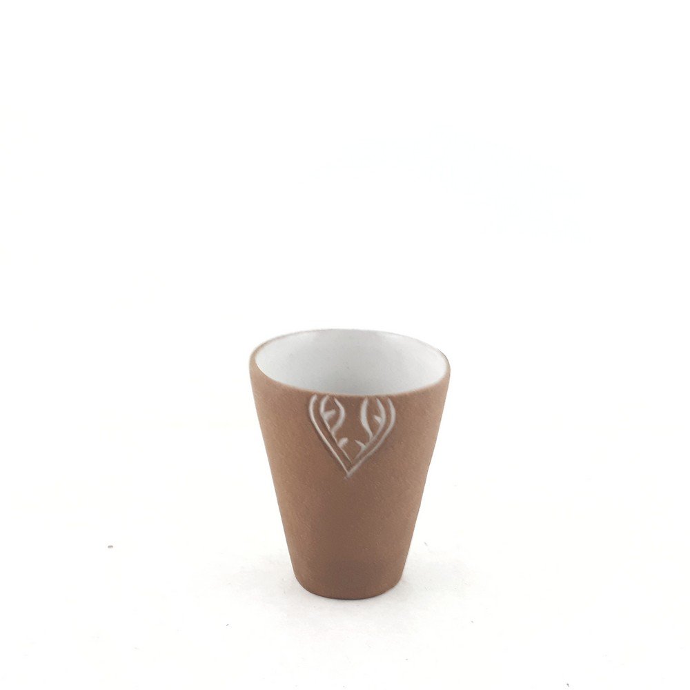 The Tonsay Velvet espresso mug offers simplicity and elegance in one small but impactful design. Its natural reddish-brown matte exterior contrasts beautifully with the glossy white glazed interior that highlights its handmade charm while maintaining practicality. A delicate lotus flower carving on one side adds an extra touch of artistry to this compact (75 ml) espresso mug.